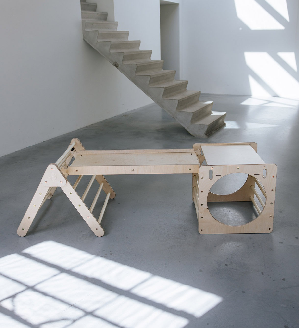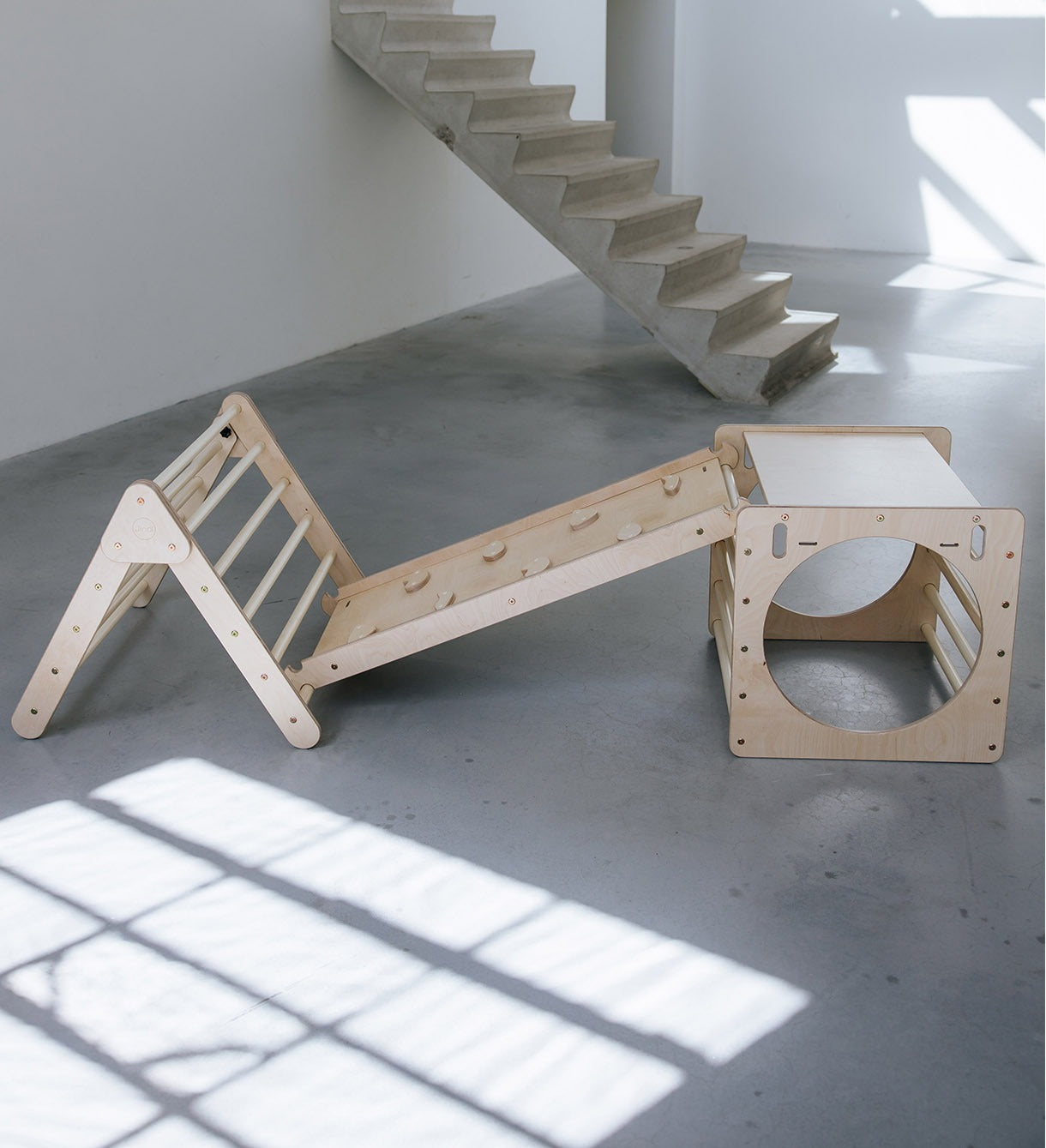 Pikler klimdriehoek, klimkubus met ladder en glijbaan/klimhelling - naturel