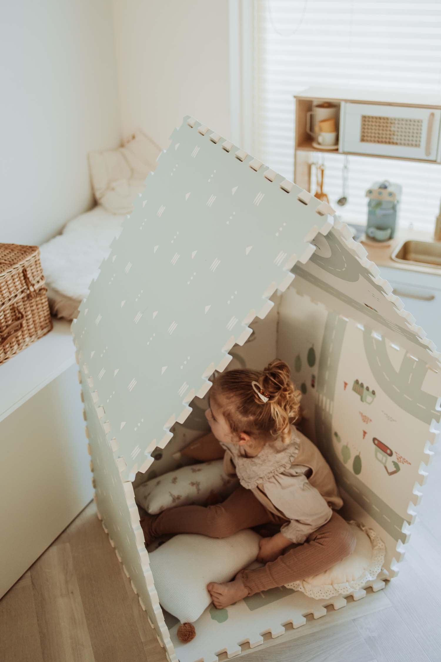 Deze speelmat is meer dan alleen een zachte ondergrond. Dankzij de slimme puzzeltegels kun je er niet alleen een mat van maken, maar ook een huisje of opbergbox bouwen. Zo wordt opruimen een speels en leuk onderdeel van de dag. Ideaal voor kleine avonturiers die graag spelen én leren!